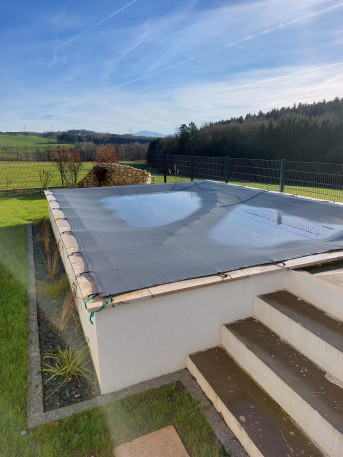 The safety net is suitable as a swimming pool cover. Even in this size, it is easy to handle and covers the area well. It is water-permeable, but keeps out larger amounts of dirt. It remains to be seen whether it prevents the formation of algae. To prevent the safety net from sagging, thin steel cables were stretched criss-cross in the pool. translated, original text: "Das Schutznetz ist geeignet als Schwimmbadabdeckung. Es ist auch in dieser Größe gut handhabbar und deckt die Fläche gut ab. Es ist wasserdurchlässig, hält aber größere Verschmutzungen ab. Ob es die Algenbildung verhindert, muss man sehen. Damit das Schutznetz nicht Durchhänger, wurden dünne Stahlseile kreuz und quer im Pool gespannt."