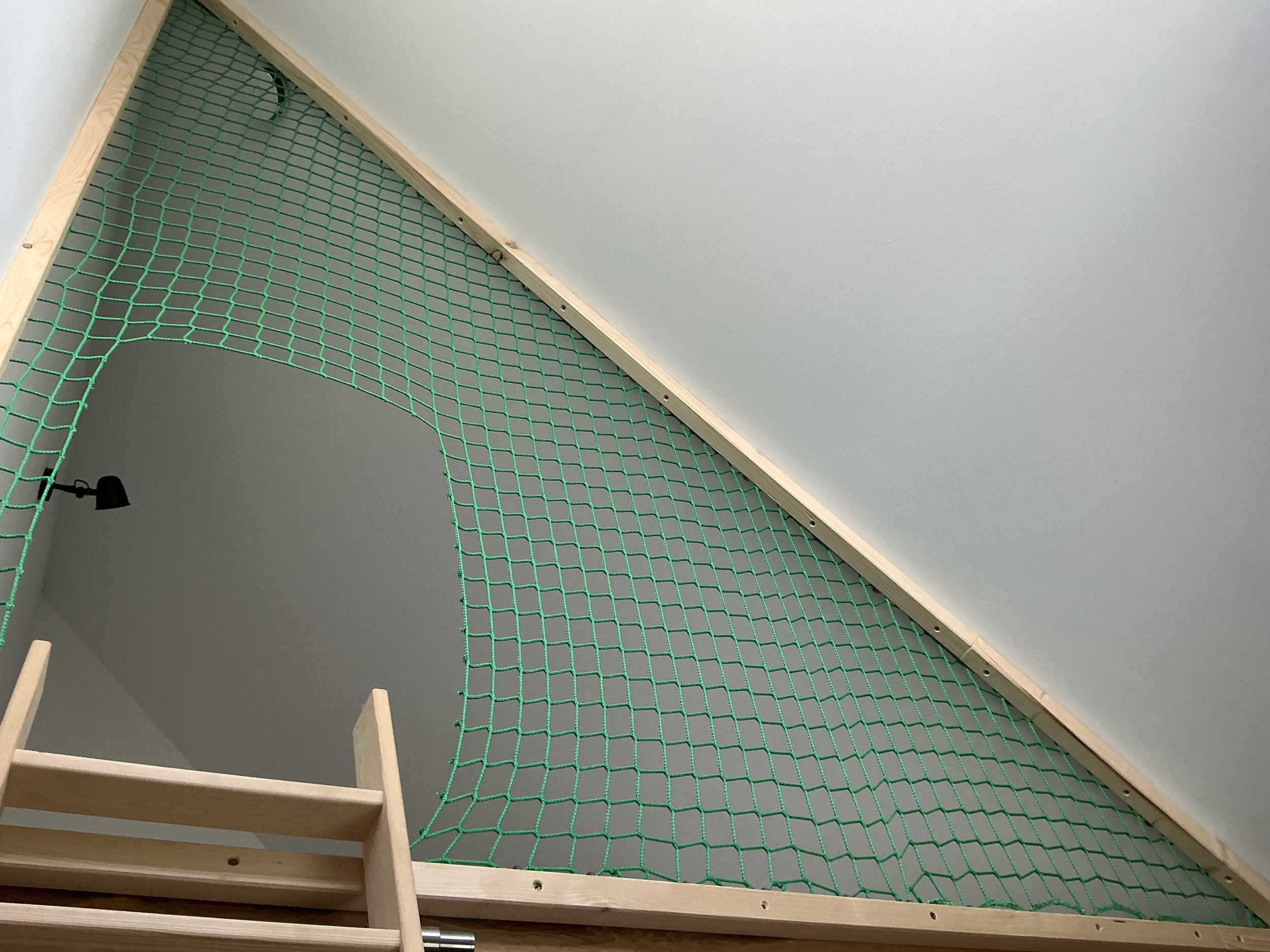 We moved into a house with a loft bed already installed, but my wife didn't like when our 4 year old went up there for safety reasons. I searched for a while to find a solution so was happy to find this website where a custom net could be made for the space. I installed just now and it works great. The delivery time was even faster than suggested upon order confirmation. translated, original text: "We moved into a house with a loft bed already installed, but my wife didn’t like when our 4 year old went up there for safety reasons. I searched for a while to find a solution so was happy to find this website where a custom net could be made for the space. I Installed just now and it works great. The delivery time was even faster than suggested upon order confirmation."
