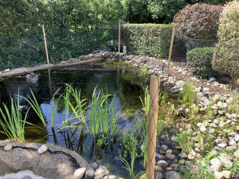 A good solution! translated, original text: "Reiherschutznetz Teilbereich Gartenteich über Tiefwasserbereich , befestigt an gebogenen ca 60 cm langen Seitenstützen für Seitenlitzen als Einstiegschutz , ab Laubabfall ist der gesamte Teich über Dachlatten mit anderem Laubschutznetz abgedeckt .
