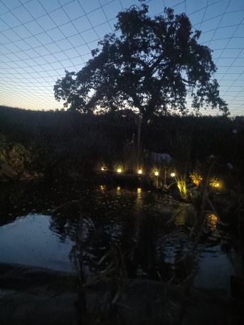 The heron net was the perfect size for our individual requirements and was easy to install. As you can see in the picture, it is almost invisible. The 10x10cm mesh is big enough for all the leaves to pass through and not form a barrier for snow in winter. So perfect. I definitely don't recommend using smaller mesh, because otherwise the leaves will get caught in the net and when it snows and the weight of the net exceeds the load-bearing capacity, meaning the net could tear and the herons would come back to the pond. The pond is 22 x 12 m and the base frame lifts the net up to 2 m from the water surface. This means herons no longer have a chance of eating our trout. Without the net, we had enormous losses of 60% due to herons. With the net, no more losses due to herons! translated, original text: "Das Reihernetz hat mit den Abmessungen nach unseren individuellen Vorgaben genau gepasst und war einfach anzubringen. Wie im Bild zu sehen ist es fast unsichtbar. Die 10x10cm großen Maschen sind groß genug, damit das gesamte Laub durchfällt und so keine Barriere für Schnee im Winter bildet. Also perfekt. Ich empfehle auf keinen Fall kleinere Maschen zu verwenden, weil sonst die Blätter im Netz hängen bleiben und bei Schneefall und dessen Last die Tragkraft überschritten würde, somit das Netz ausreißen könnte und die Reiher wieder an den Teich kommen würden. Der Teich ist 22 x 12 m und das Untergestell hebt das Netz bis zu 2m von der Wasseroberfläche weg. Reiher haben also keine Chance mehr unsere Forellen zu fressen. Ohne netz hatten wir enorme Verluste von 60% durch Reiher. Mit dem Netz keine Verluste durch Reiher mehr!"