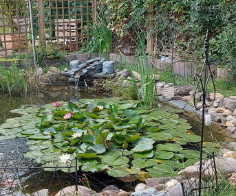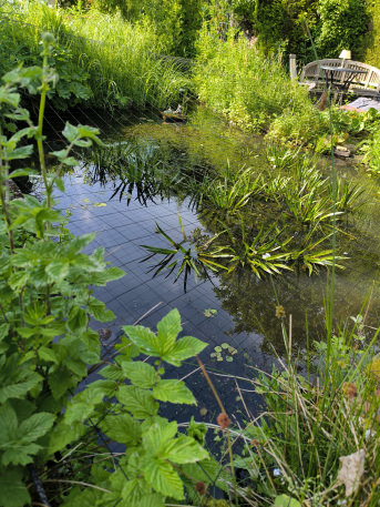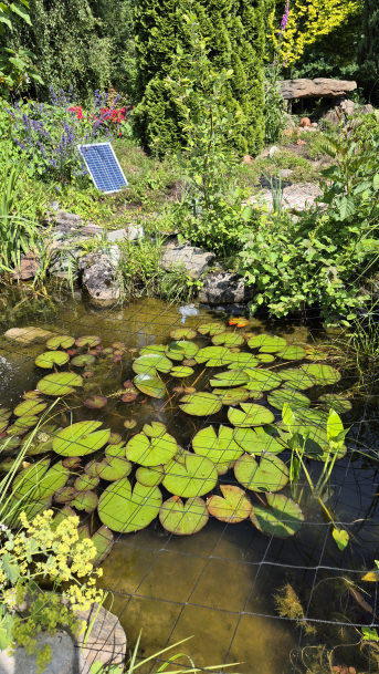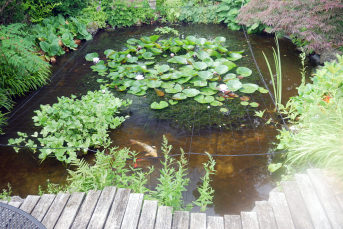 Gute Teichabdeckung, die Raum für Pflanzen und Libellen lässt, aber nicht für den räuberischen Reiher.