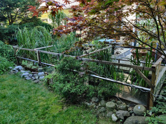 Pond protection against herons, attached to a bamboo frame. Cut sections according to dimensions with recommended borders allow easy access to the pond if required. Nets are very stable and fully serve their purpose. translated, original text: "Teichschutz vor Fischreiher, angebracht an Bambusgestell. Zugeschnittene Teilstücke gemäß Maßangaben mit empfehlenswerter Umrandung erlauben bei Bedarf einfachen Zugang zum Teich. Netze sind sehr stabil und erfüllen voll und ganz ihren Zweck."