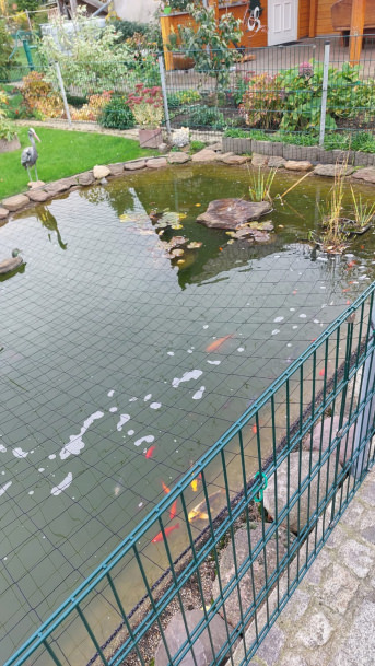 Today the new net was stretched over our pond. This way the heron will have no chance of catching fish! Visually the net is hardly noticeable! ???? It looks stable. translated, original text: "Heute wurde das neue Netz über unseren Teich gespannt. So wird der Reiher keine Chance zum Fischfang haben! Optisch fällt das Netz kaum auf! ???? Es macht einen stabilen Eindruck."