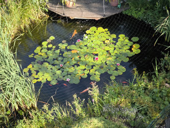 Good pond cover that leaves room for plants and dragonflies, but not for the predatory heron.
