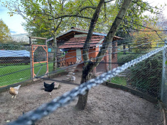 The net is used as a bird protection net so that the chickens don't fly over the fence and no birds of prey come in from above.