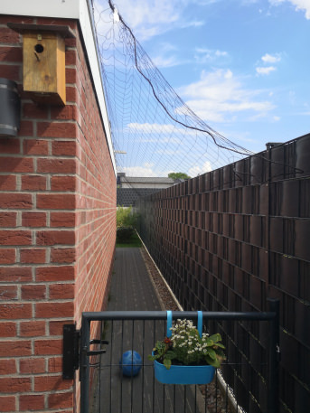 The large mesh should ensure that the birds can still get through and don't get stuck. translated, original text: "Das Netz dient als Ballfangnetz um zu verhindern das die Fußbälle von Junior nicht zum Nachbarn fliegen.